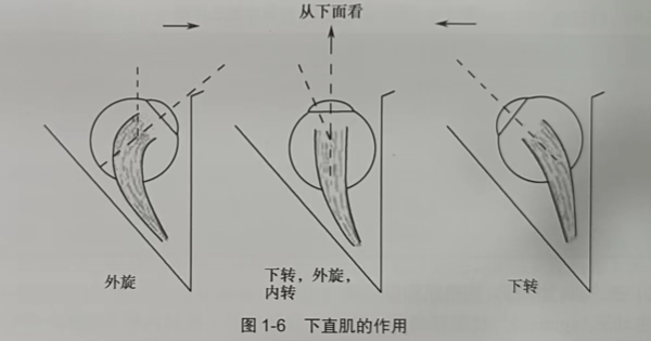 4.下直肌 下直肌与视轴约成23°夹角,眼球在原在位时,下直肌的主要作用是使眼球下转,次要作用为内转和外旋。当眼球外转23°时,仅有下转作用;当眼球内转时,肌肉的平面与视轴垂直,则主要作用为外旋,次要作用为内转(图1-6)。