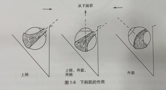 6.下斜肌 下斜肌与视轴成51°夹角,眼球处于原在位时,下斜肌的主要作用是使眼球外旋,次要作用为上转及外转。当眼球内转动51°时,只有上转作用;当眼球外转时,下斜肌肌肉与视轴垂直,此时主要作用为外旋,次要作用为外转(图1-8)。