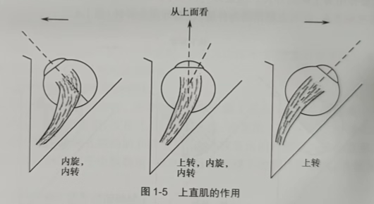3.上直肌 上直肌与视轴约成23°夹角,眼球在原在位时,上直肌的主要作用是使眼球上转,次要作用是内转及内旋。当眼球外转23°时,仅有上转作用;当眼球内转时,肌肉平面与视轴垂直,主要作用为内旋,次要作用为内转(图1-5)。
